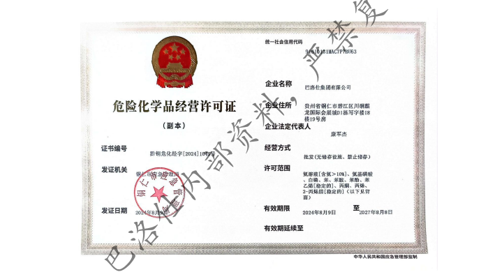 从持证经营到专业团队,从制度建设到技术赋能,巴洛仕集团的危化品经营许可证绝非一纸空文,而是其合规运营与卓越能力的集中体现。这张许可证背后,是国家法律法规的刚性约束,是专业团队的持续守护,是对行业最高标准的自觉对标。